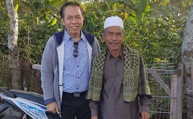 “Banyak cerita, mulai dari kebun kopi hingga sejarah Jokowi menjadi anak angkatnya dulu,” ujar Benny sambil berfoto dengan H Nurdin yang tampil berkopiah dan sorban. (Smn).