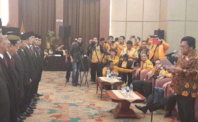Pelantikan ini dipimpin oleh Ketum Hanura Oso sembari menyelempangkan dan mengambil sumpah jabatan para anggota Mahkamah Partai Hanura. (Smn).