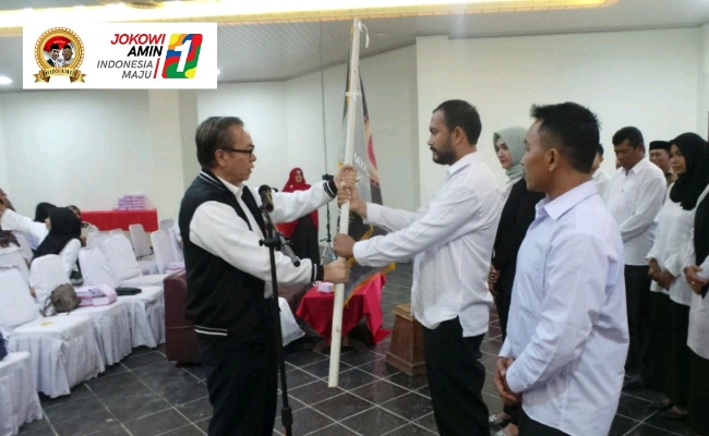 Matanurani, Aceh Utara – Ketua Umum Relawan DOJO – AMIN (Doa Untuk Jokowi dan Ma’ruf Amin), Benny Pasaribu mengukuhan pengurus relawan DOJO-AMIN DPW Provinsi Aceh di Kabupaten Aceh Utara di Hotel Lido Graha Aceh Utara, Selasa (4/12) sore. (Smn).
