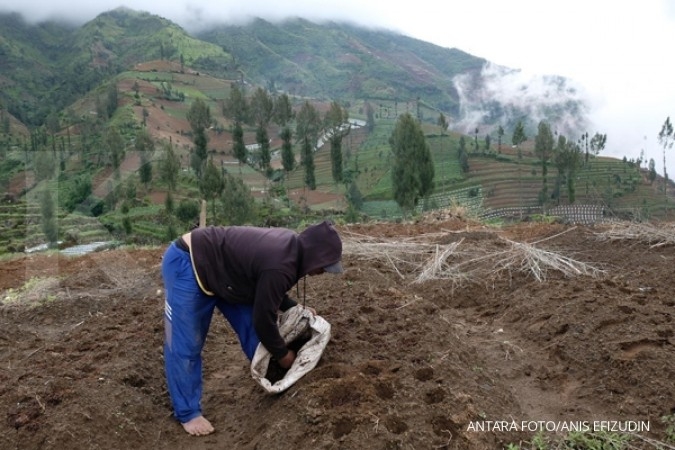 Petani beraktivitas di ladang berlatar belakang perbukitan yang dijadikan lahan pertanian di Desa Canggal, Candiroto, Temanggung, Jawa Tengah, Senin (18/3/2019). Kurangnya kesadaran sebagian warga sekitar hutan akan pentingnya pelestarian alam mengakibatkan penjarahan hutan milik Perhutani untuk lahan pertanian sehingga dikhawatirkan bisa mengakibatkan banjir bandang dan tanah longsor. ANTARA FOTO/Anis Efizudin/foc.