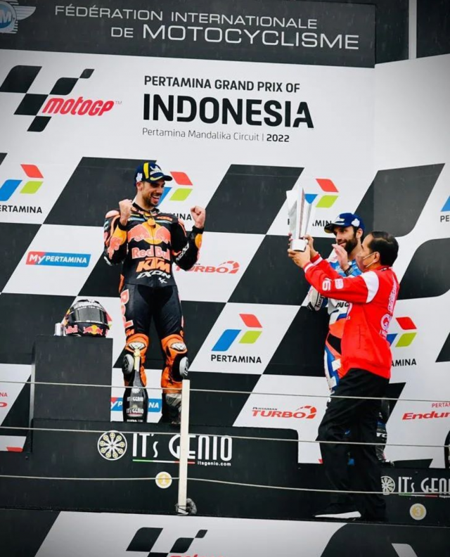 Sebelumnya, Jokowi turut naik ke podium untuk menyerahkan trofi kepada para pemenang pada gelaran bertajuk Pertamina Grand Prix of Indonesia tersebut. Miguel Oliveira, pembalap tim Red Bull KTM Factory Racing, berhasil menjadi juara setelah menyelesaikan balapan 20 lap dengan waktu 33 menit 27.2230 detik.