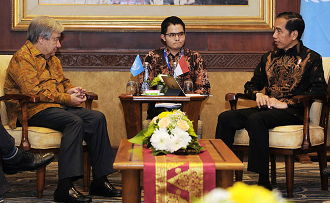 Matanurani, Nusa Dua – Presiden Joko Widodo melakukan pertemuan bilateral dengan Sekretaris Jenderal Perserikatan Bangsa-Bangsa Antonio Guterres di Ruang Balai Citra, Hotel The Laguna Resort & Spa Nusa Dua, Bali, Kamis (11/10).