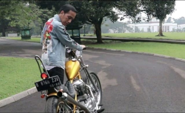 Jokowi tiba pukul 11.45 WIB dengan mengendarai sepeda motor Chopperland hasil modifikasi Royal Enfield Bullet 350 CC yang dibeli pada Januari 2018. (Ant).