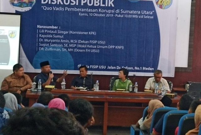 Matanurani, Medan – Diskusi publik dengan tema “Quo Vadis Pemberantasan Korupsi di Sumatera Utara” digelar di Fisip USU Medan, Kamis (10/10) dengan pembicara Lili Pintauli Siregar (Komisioner terpilih KPK), Dr Muryanto Amin (Dekan Fisip USU), Sugiat Santoso SE MSp (Wakil Ketua Umum DPP KNPI) dan Dr Zulfirman SH MH (dosen FH USU).