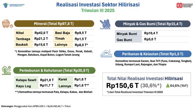 Matanurani, Investasi proyek hilirisasi di Indonesia telah mencapai Rp 431,4 triliun, atau setara 30,1% dari total realisasi investasi sepanjang periode Januari-September 2025 yang senilai Rp 1.434,3 triliun.