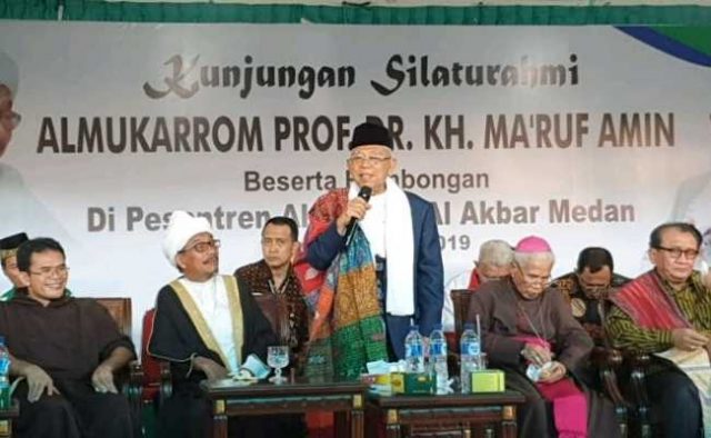 Matanurani, Jakarta — Cawapres nomor urut 01 KH Maruf Amin bersilaturahim dengan berbagai tokoh lintas agama di Pesantren Al-Kautsar yang diasuh Syekh Ali Marbun, di Medan, Sumatera Utara, Sabtu (9/3) petang. Kepada tokoh lintas agama, Kiai Maruf berpesan agar selalu menjaga keutuhan bangsa.