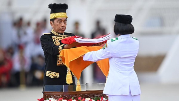 “Kepada sang Merah Putih hormat senjata, grak,” kata Komandan Upacara Kolonel Inf Nur Wahyudi setelah bendera dibentangkan, dikutip Sabtu (17/8).