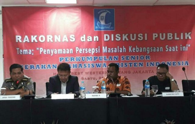 Dalam even yang bertajuk “Penyamaan Persepsi Masalah Kebangsaan terkini,” dihadiri oleh beberapa narasumber diantaranya, Tenaga Ahli Lemhanas Dr. Timotius Harsono, Ketua PGI Pdt. Albertus Patty. (Ian)