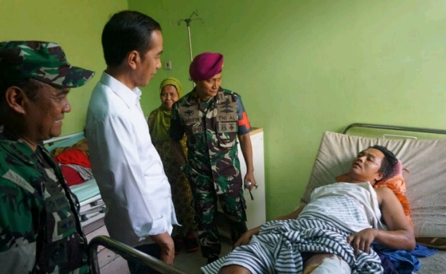 Matanurani, Pandeglang, Banten – Presiden Joko Widodo menjenguk korban tsunami Selat Sunda di Puskesmas Labuan, Kabupaten Pandeglang, setelah mendarat di Lapangan Ahmad Yani pada Senin.