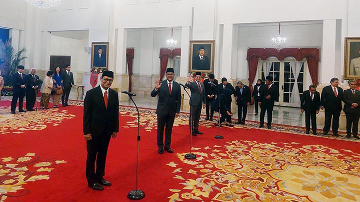 Tak lama kemudian, Presiden Jokowi tiba di ruang pelantikan. Ketiganya langsung disumpah untuk mengemban amanah jabatan untuk sekitar tiga bulan terakhir masa pemerintahan Jokowi-Maruf Amin. “Menimbang, mengingat, memutuskan, menetapkan, mengangkat wakil menteri negara Kabinet Indonesia Maju dalam sisa masa jabatan masing-masing […] Sudaryono sebagai Wakil Menteri Pertanian, Thomas A. M Djiwandono sebagai Wakil Menteri Keuangan, Yuliot selaku Wakil Menteri Investasi/Badan Koordinasi Penanaman Modal,” demikian bunyi surat keputusan presiden yang dibacakan di Istana Kepresidenan, Jakarta, Kamis (18/7).