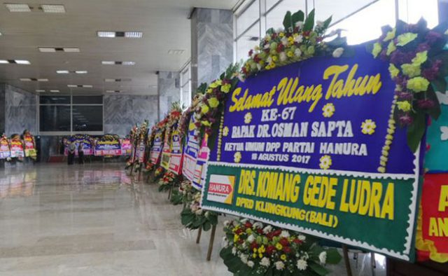 Matanurani, Jakarta – Deretan karangan bunga menghiasi lobi Gedung Nusantara III, Kompleks Parlemen, Senayan, Jakarta. Karangaan bunga ditujukan untuk Ketua DPD Oesman Sapta Odang yang tepat pada hari ini, 18 Agustus 2017 berulang tahun yang ke-67.