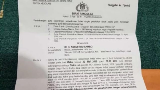 Sesuai surat panggilan, dugaan tidak pidana itu terjadi pada 17 April 2019, di kediaman capres Prabowo Subianto di Jalan Kertanegara, Kebayoran Baru, Jakarta Selatan. Uztas Sambo dipanggil terkait laporan yang dibuat oleh DR. Suryanto.(Viv).