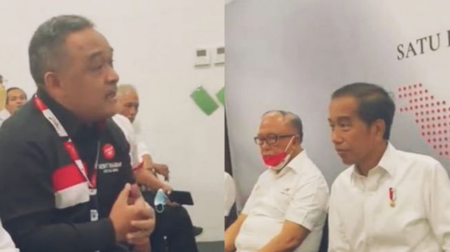 Baik Jokowi maupun Benny Rhamdani memasang wajah serius saat terjadi percakapan soal perang dengan yang kontra pemerintah.